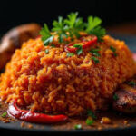 Basmati rice, tomatoes, Onions, Red bell peppers, Scotch bonnet/chili peppers, Garlic, Ginger